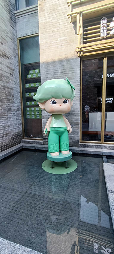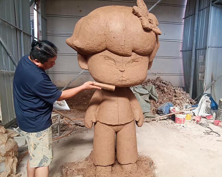 此雕塑高度达到2.1米,头部比例比较夸张,在制作泥稿的时候,非常有挑战性。此玻璃钢雕塑作品造型也非常微妙,体态圆润,要求达到”婴儿肥“效果。该餐饮企业新店开业,制作周期1个月,总的来说还是比较紧张。